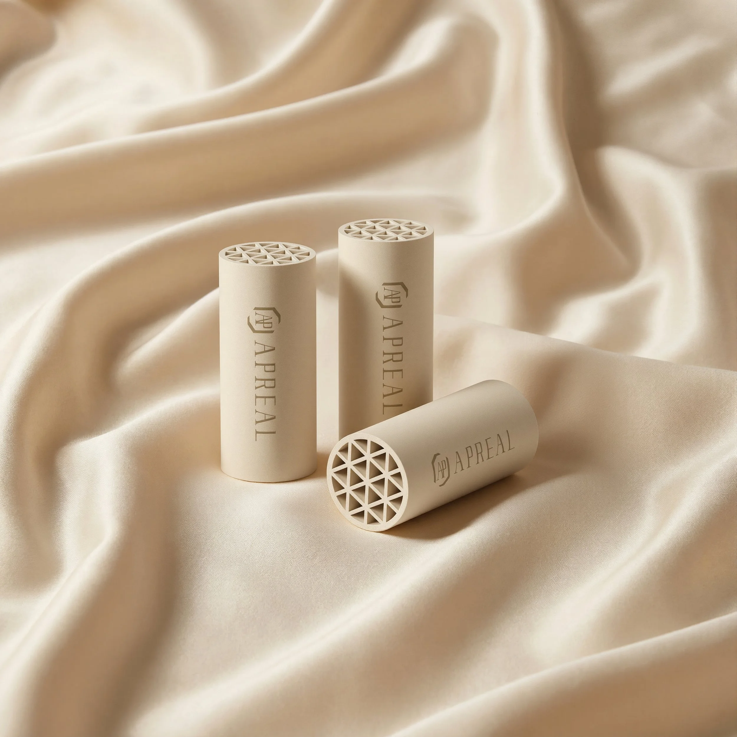 A high-strength alumina–silica honeycomb ceramic provides a chemically inert, low-resistance airflow framework with maximized working surface area.